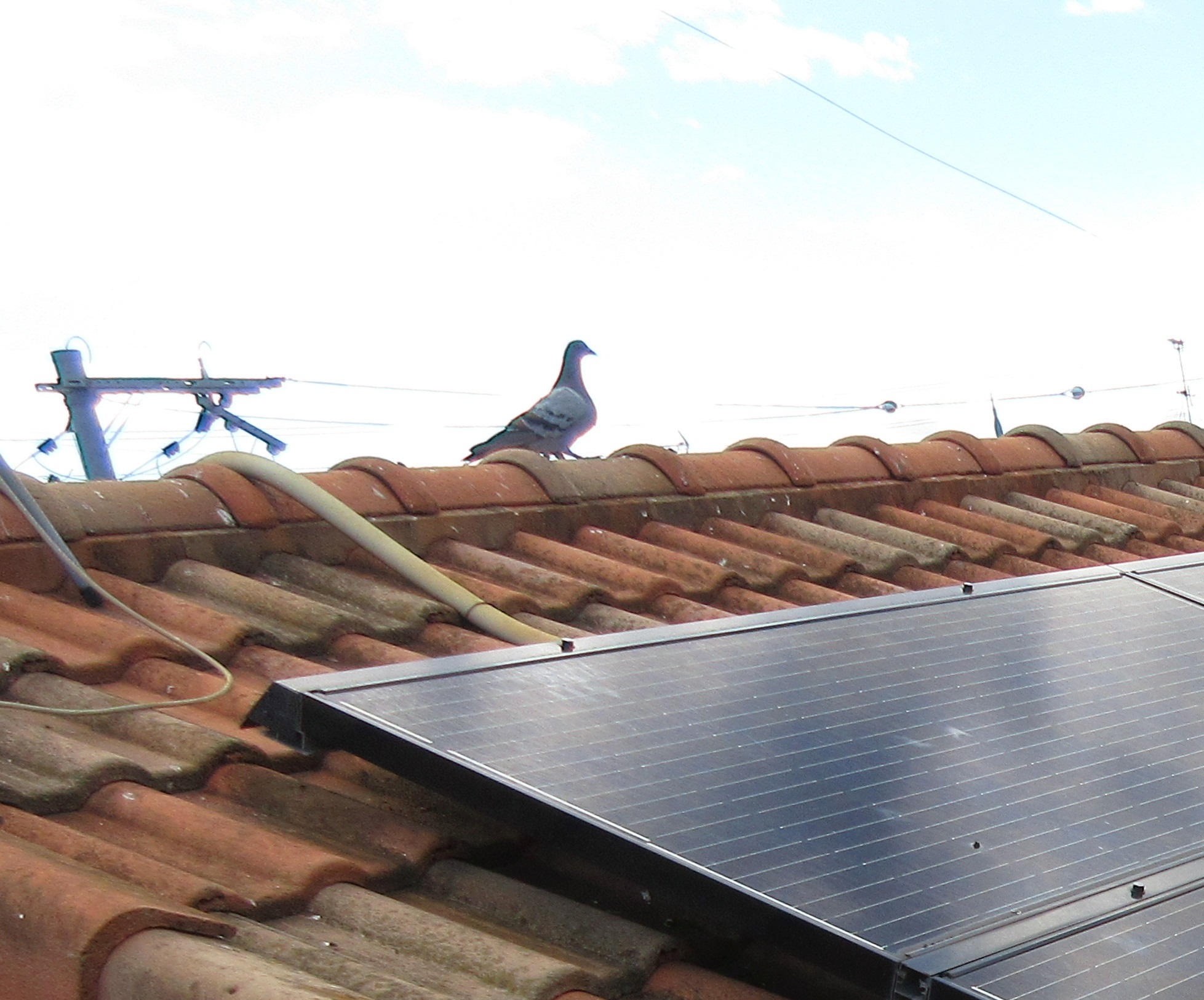 すでに設置された太陽光パネルの下に鳩などの鳥の巣があり騒音やフン害でお困りの方がおられます。対処方法として鳥除けネットを取り付けてパネル下
